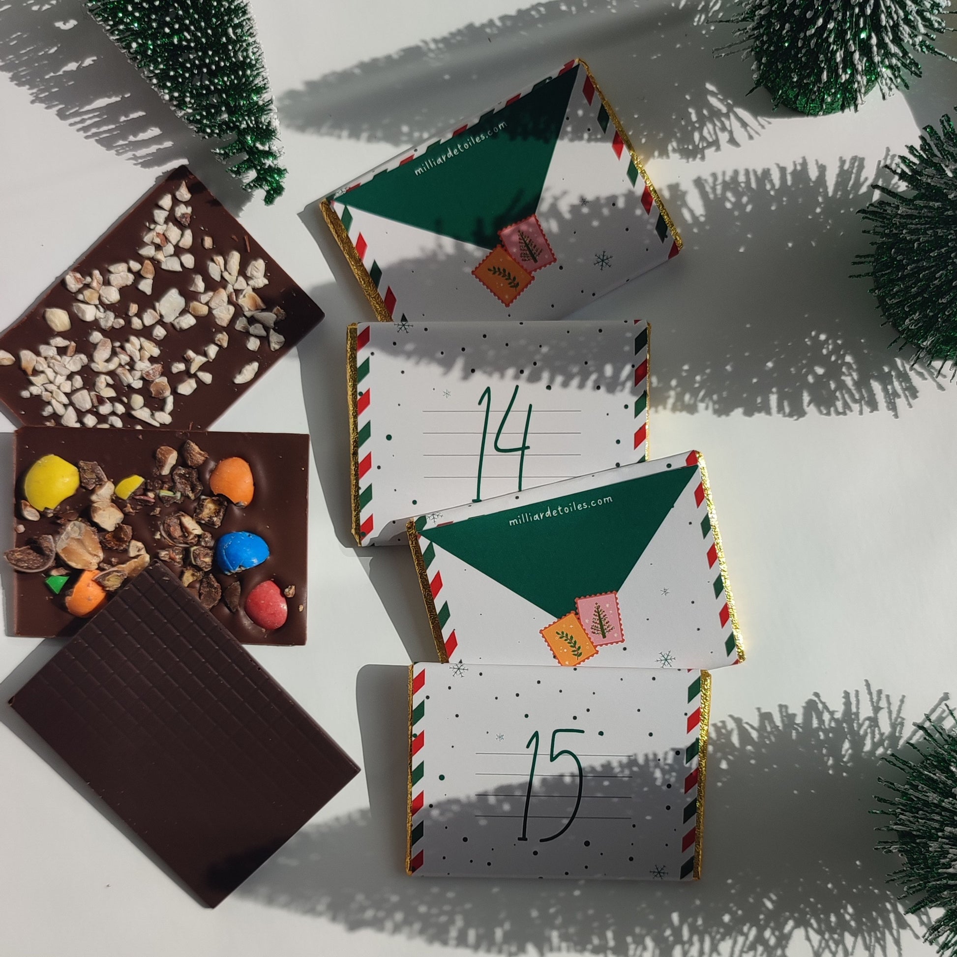 - CONTENU : 24 carrés de chocolat artisanal, faits main en Bretagne, avec possibilité de choisir : - ton chocolat préféré (noir 70% ou lait 41%) - tes inclusions gourmandes (coco, éclats d’amandes, éclats de noisettes) - ou un assortiment panaché pour varier les plaisirs chaque jour.