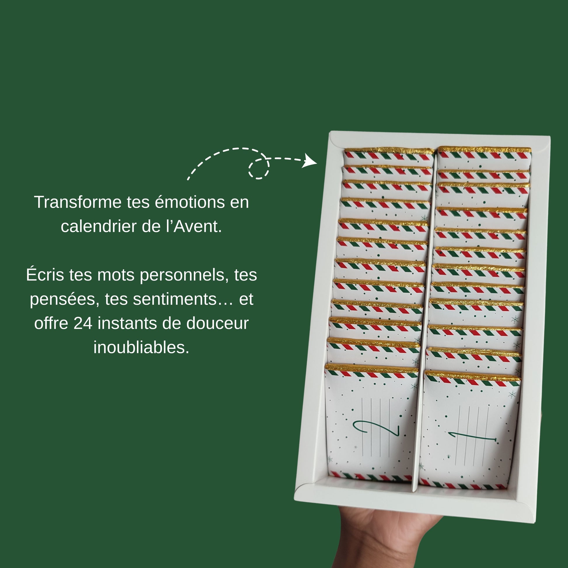- PERSONNALISATION : Et si, cette année, tu transformais tes émotions en calendrier de l’Avent ? Écris tes mots personnels, tes pensées, tes sentiments… et offre 24 instants de douceur inoubliables.